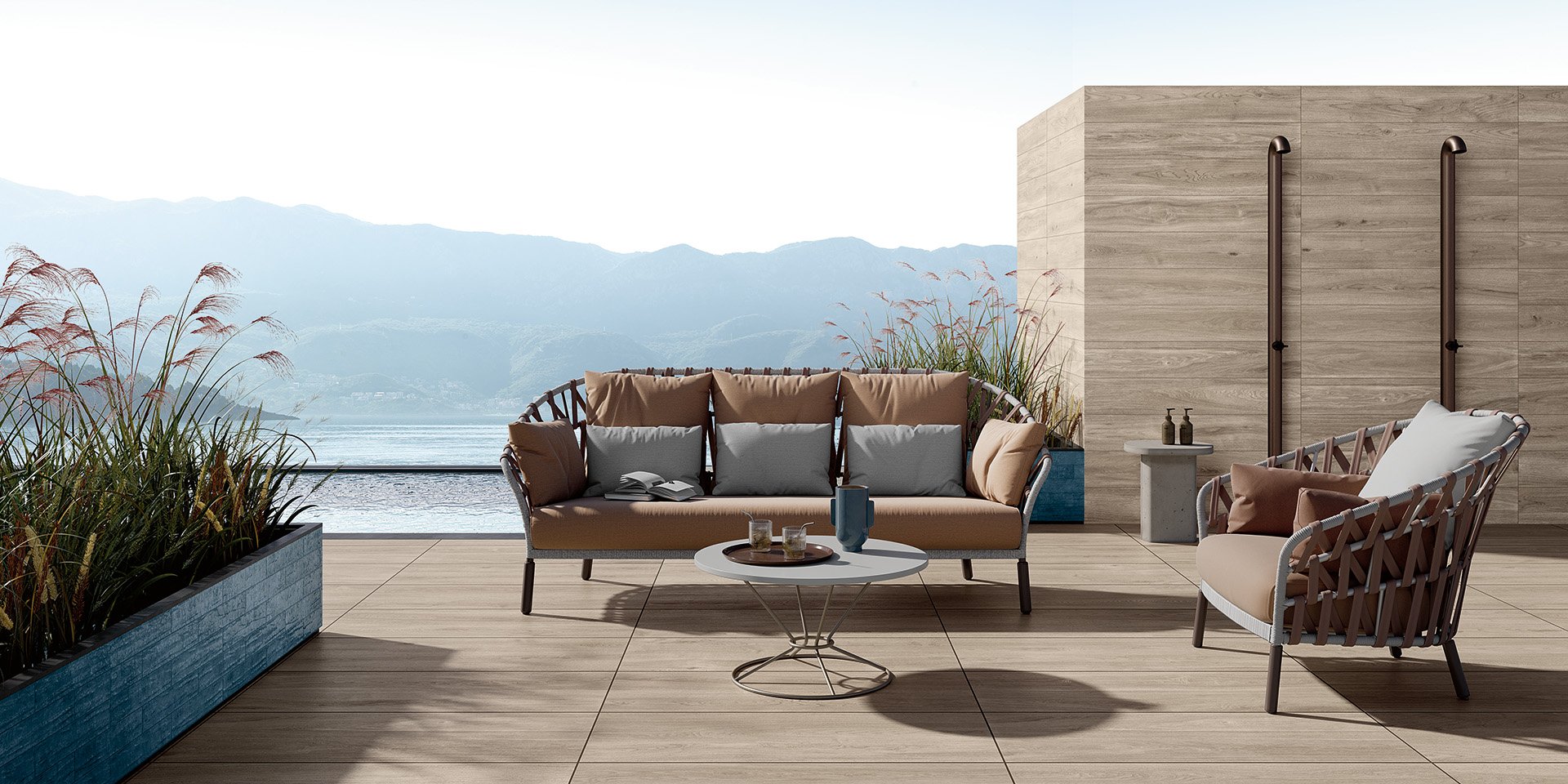 Wood-effect porcelain stoneware paving tiles in large rectangular sizes (60x120 and 40x120), ideal for creating outdoor surfaces with safety guaranteed by the grip surface and styled to blend perfectly into a garden or natural surroundings.