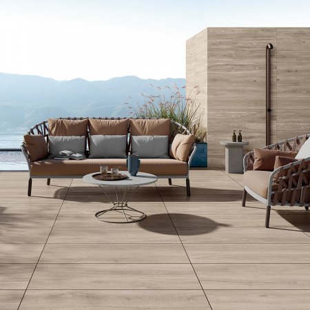The Yourself collection of outdoor porcelain stoneware surfaces in 20 mm thickness evolves from the union between primordial and modern elements, creating a continually evolving concrete effect inspired by the colours of the different seasons. Coloured pigments amalgamate with the stoneware to generate a rich range of neutral, earthy and lunar hues. There are three colour variants available: Light Grey, Creme and Earth. Creme evokes a mood of serenity and comfort, while Earth represents the nature of desert and Mediterranean climes. Light Grey embraces a grunge style. The entire outdoor collection matches the indoor floor tiles.