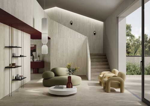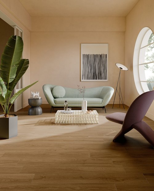 A functional, yet aesthetically pleasing space that can be achieved by distinguishing the two rooms using different modern interior floors. Porcelain stoneware tiles that differ in terms of their aesthetics or size optically divide the two spaces, leaving the furnishings to physically demarcate the areas of the house.