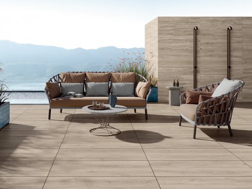 L'effet bois est parfait pour la décoration intérieure et l'utilisation extérieure en version antidérapante. Dans les revêtements de sol extérieurs, le grès cérame présentant cette texture s'intègre parfaitement à la nature : elle en met en valeur les couleurs et l'atmosphère, tout en créant une continuité esthétique du sol de toute beauté lorsque l'on utilise la même collection de carreaux qu'à l'intérieur.