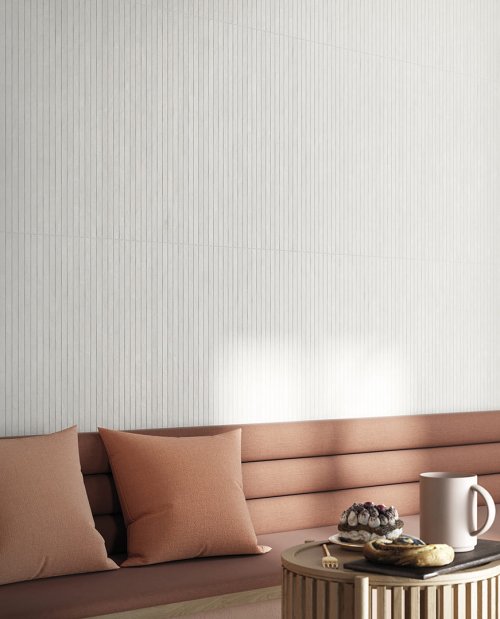 La texture essenziale di una pietra morbida e avvolgente per pavimenti e rivestimenti in gres