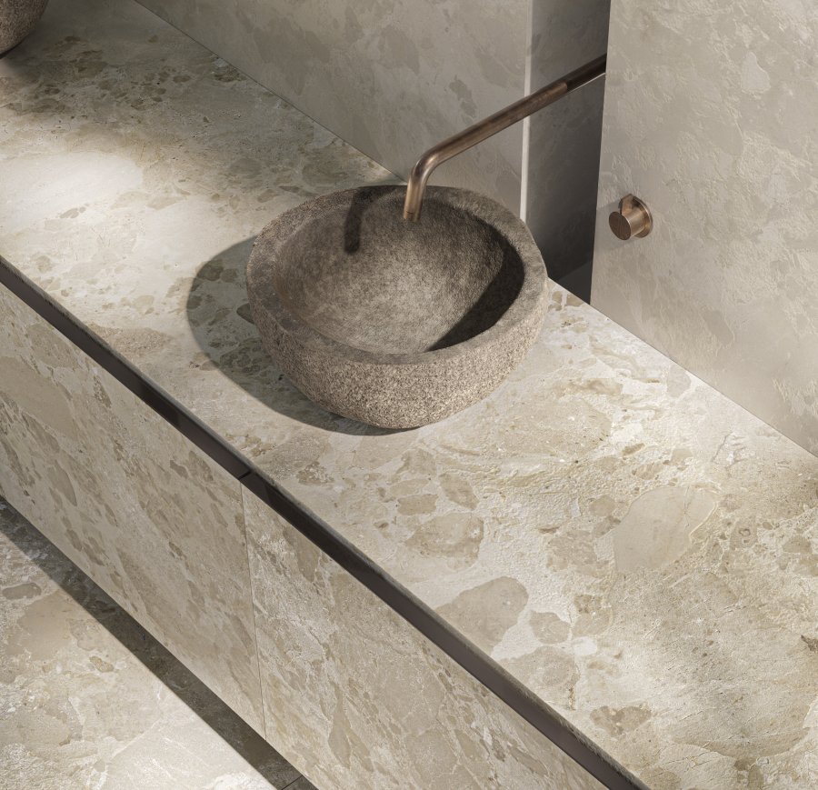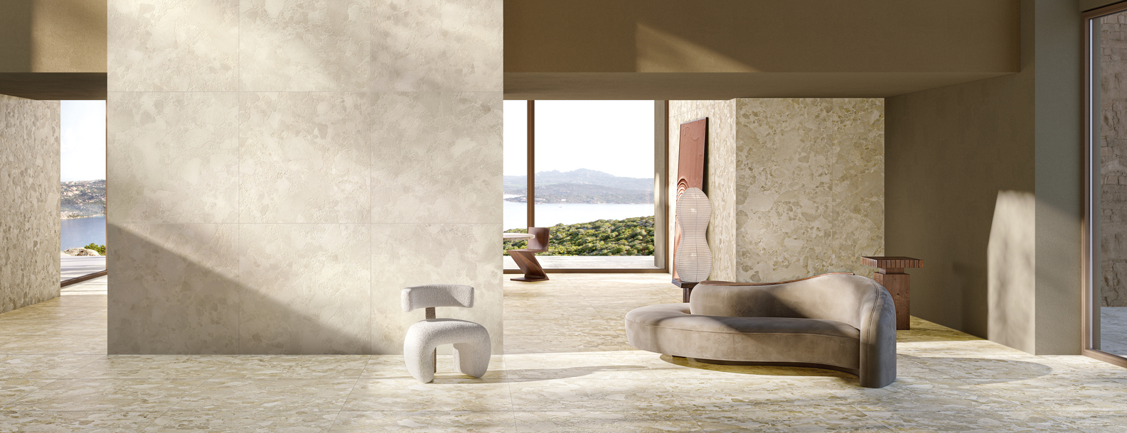 Levante nasce dall’energia del vento, che attraversa la materia e la modella con segni, tracce e variazioni materiali e cromatiche. Le superfici, in gres porcellanato evoluto, assumono le sembianze di paesaggi vivi che si lasciano attraversare dalla luce e dall’aria, portando negli spazi un dinamismo misurato ed elegante. È un invito ad abitare in armonia con l’essenziale, liberando l’architettura dal superfluo e riscoprendo l’autenticità della pietra in chiave contemporanea.