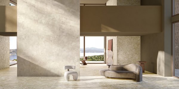 Le superfici in gres porcellanato evoluto assumono le sembianze di paesaggi vivi, dove la luce e l'aria interagiscono con i dettagli, creando un dinamismo misurato ed elegante.